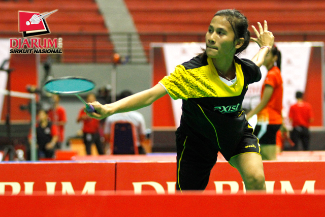 Priskila Siahaya (Exist) mengembalikan shuttlecock ke arah Febtria Adisthya (Mutiara Bandung).