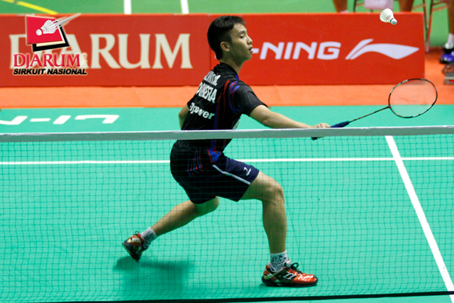 Forverio Rivaldo (PB Djarum) mengembalikan shuttlecock ke arah Bagas Kristianto (PB Djarum).