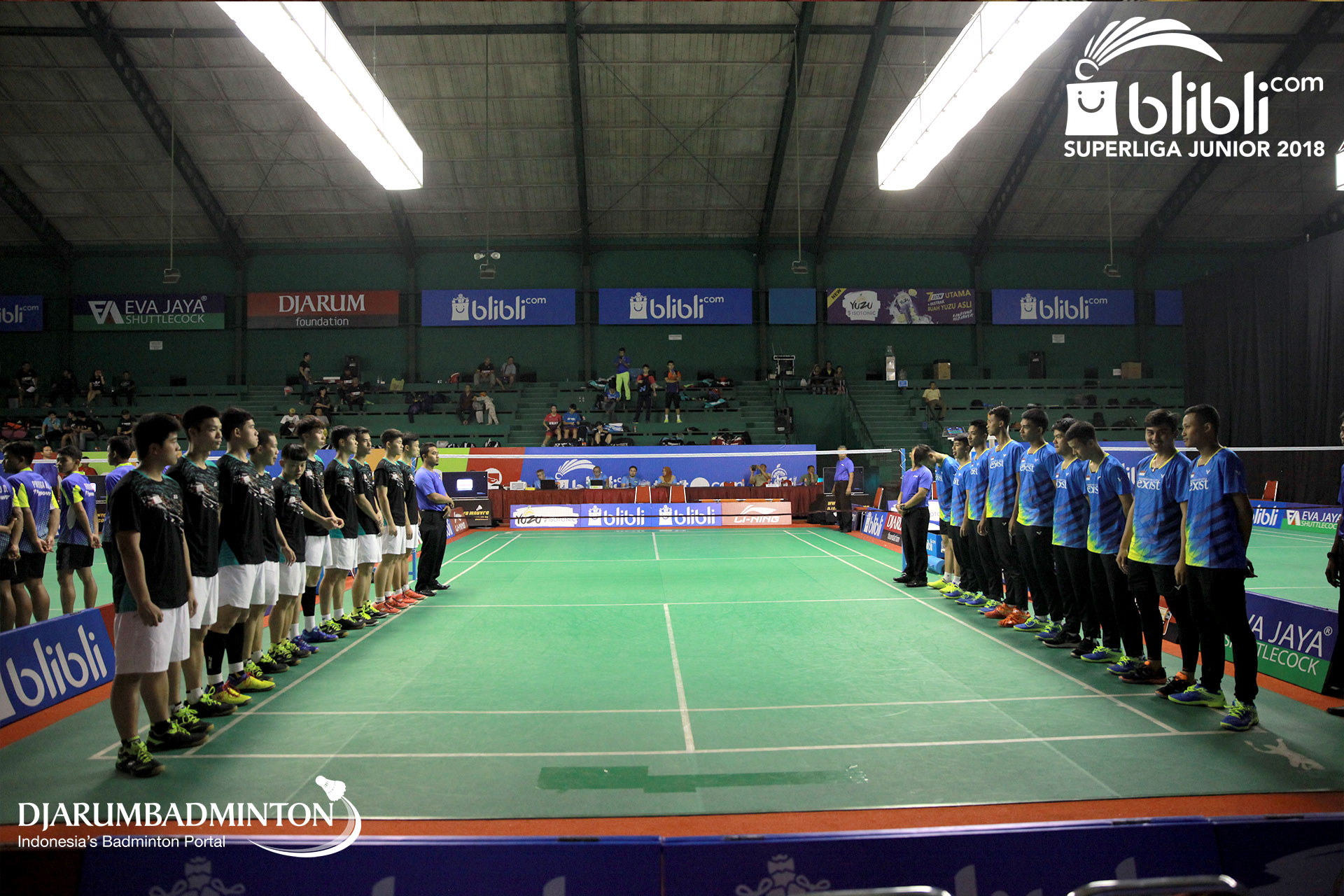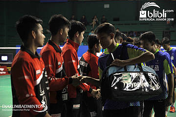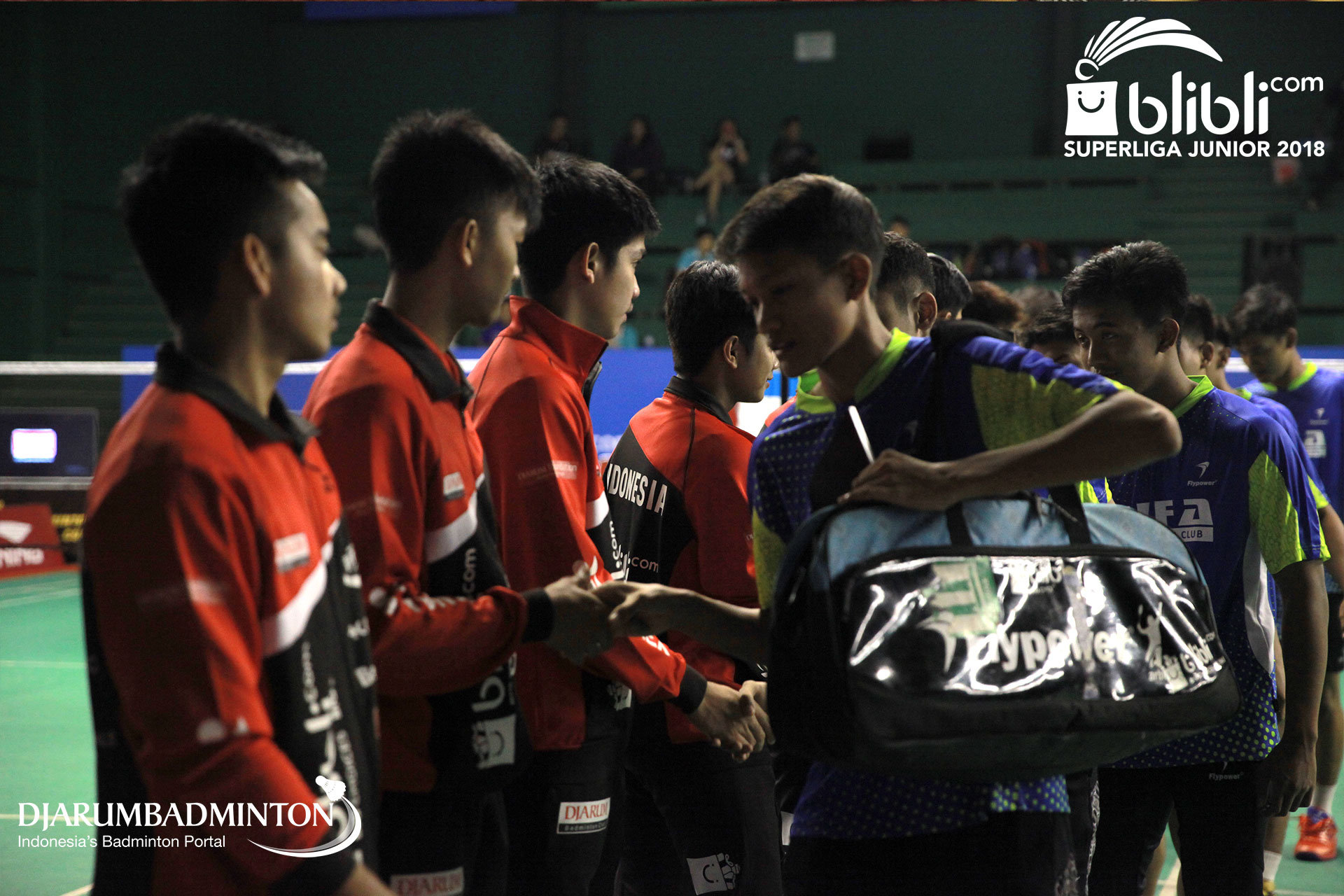Tim putra U19 Djarum bersalaman dengan Tim putra U19 PB. Fifa Sidoarjo