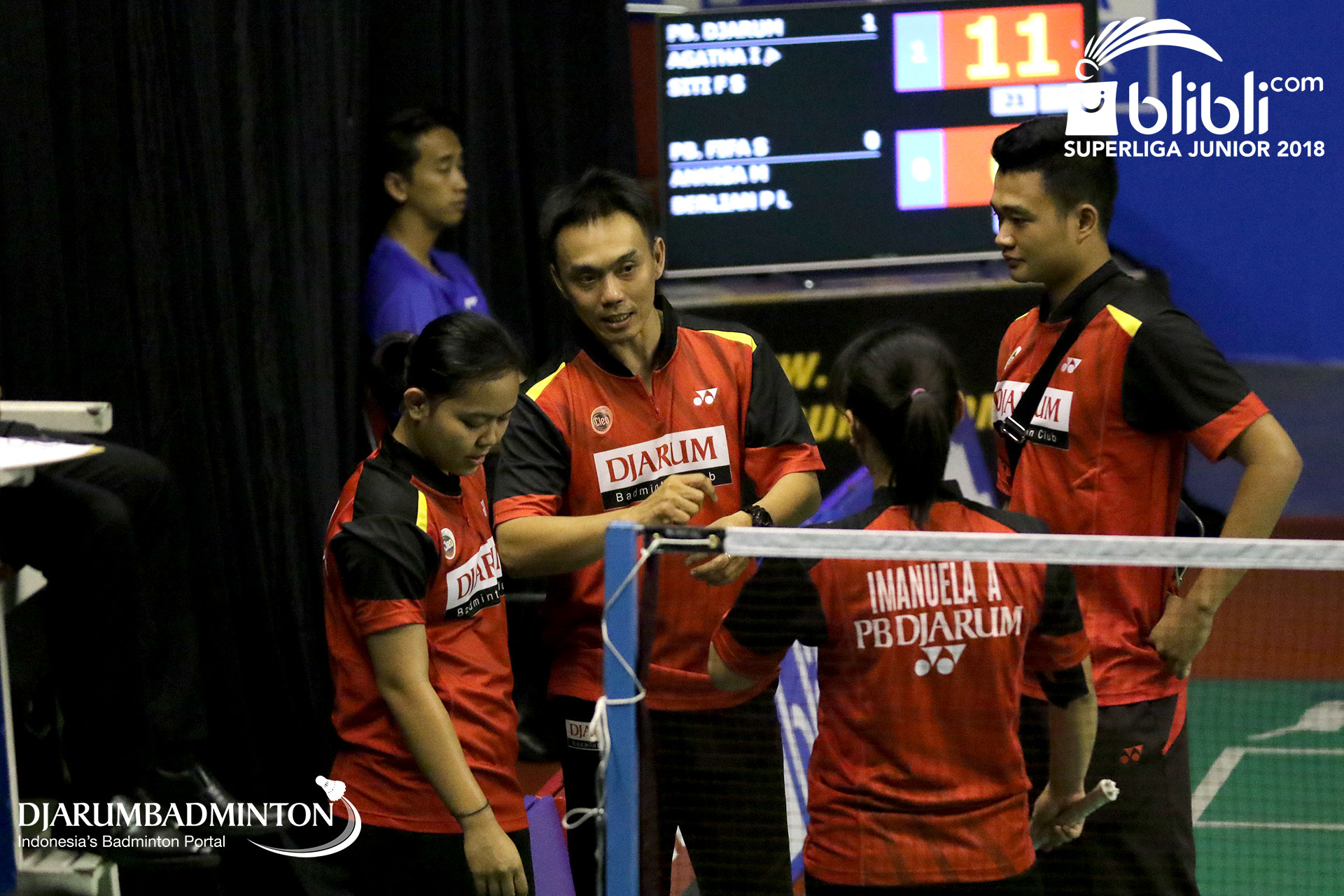Agatha Imanuela/Siti Fadia Silva Ramadhanti (PB. DJARUM) mendapat pengarahan dari pelatih