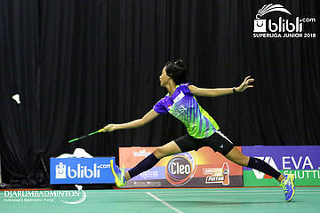 Putri Kusuma Wardani (PB. EXIST) berusaha mengembalikan shuttlecock
