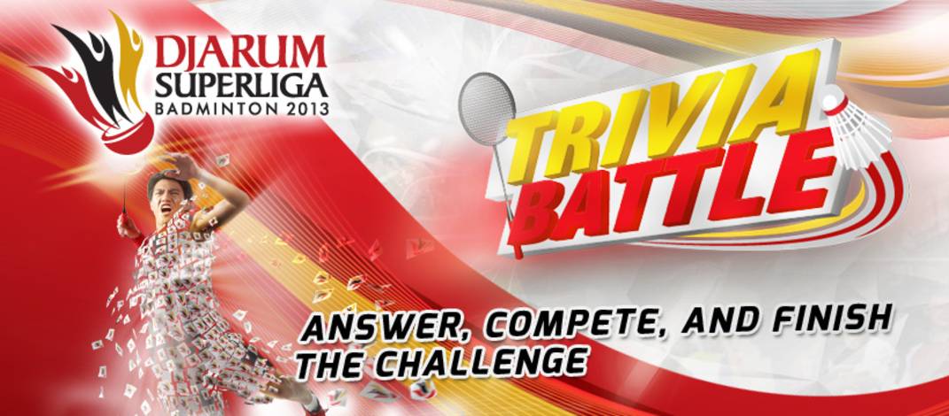 Tahu banyak mengenai Djarum Superliga? Kamu bisa mencoba permainan Trivia Battle Djarum Superliga 2013. Selain dapat menambah pengetahuan kamu mengenai perhelatan Djarum Superliga, kamu juga bisa menantang teman kamu untuk bermain Trivia Battle.