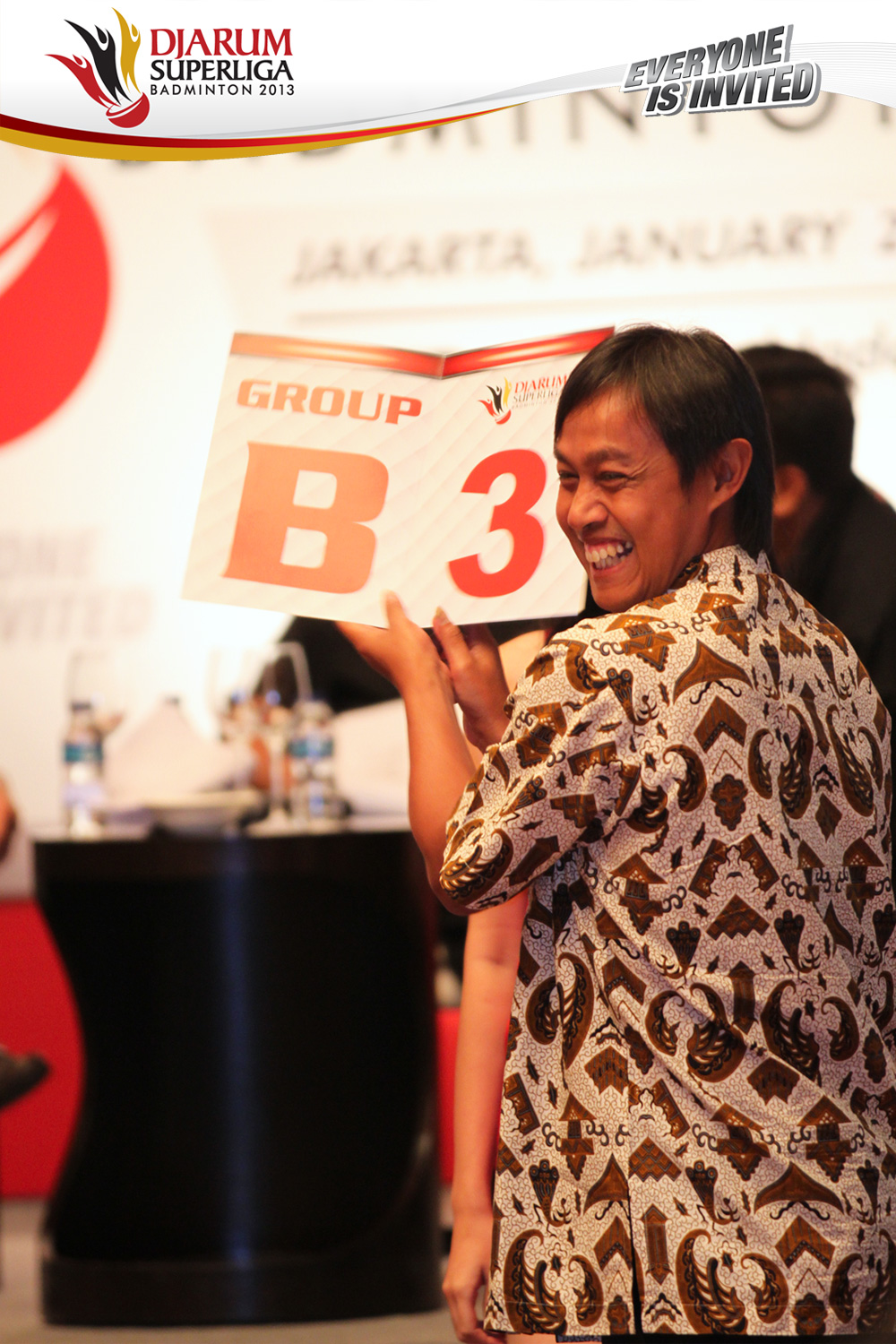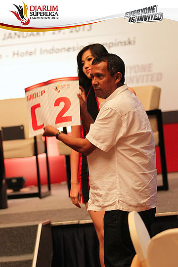 Perwakilan PB Jaya Raya Jakarta, Bambang Suprianto saat pengambilan undian drawing Djarum Superliga Badminton 2013