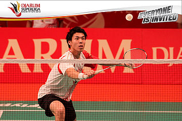 Riichi Takeshita (Tonami Badminton Club Jepang) berusaha mengembalikan kok ke arah Lee Hyun Il (PB Musica Champion)