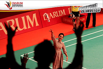 Porntip Buranaprasertsuk (PB Mutiara) memberikan salam kepada seluruh penonton Djarum Superliga Badminton 2013 yang telah mendukungnya di DBL Arena Surabaya