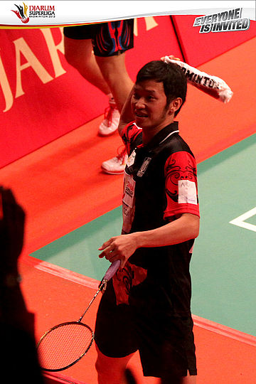 Andre Kurniawan (PB Djarum) menyambut serve dari Takuma Ueda (Unisys Badminton Club Jepang)