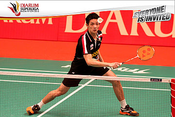 Daren Liew (Malaysia Tigers) bersiap mengembalikan kok ke arah Boonsak Posana (Jaya Raya)