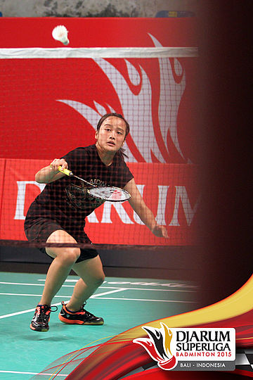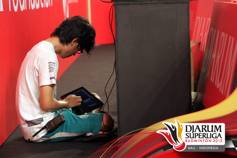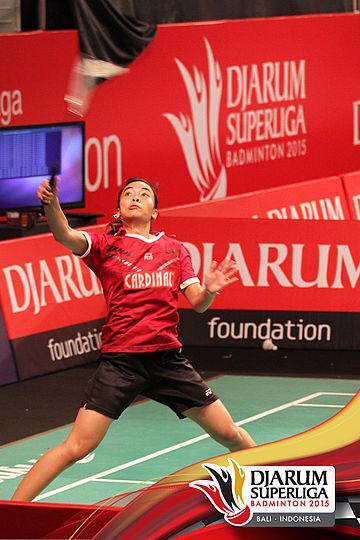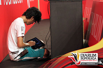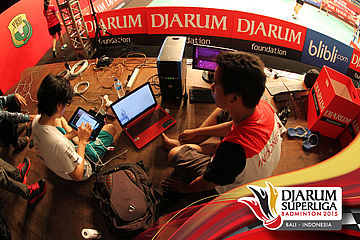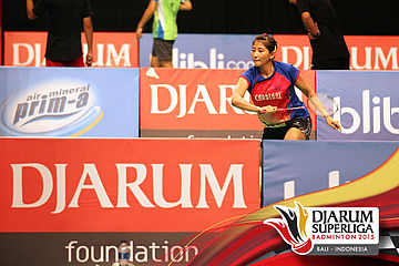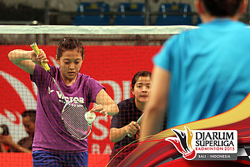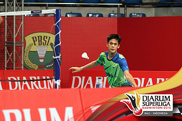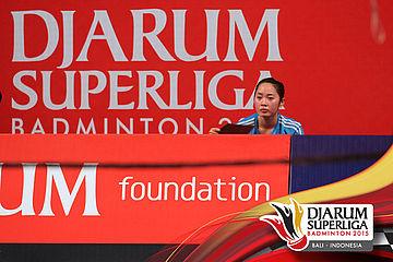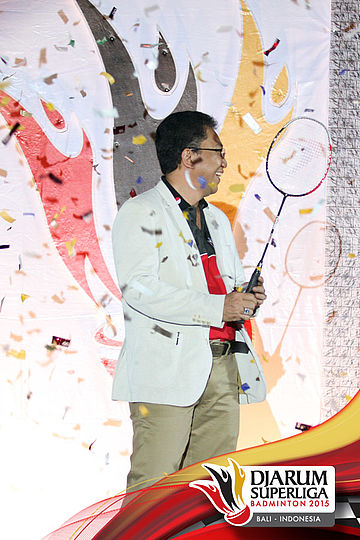 Achmad Budiharto (Direktur Superliga) usai membuka gelaran Djarum Superliga 2015 dengan simbolis pemukulan shuttlecock.