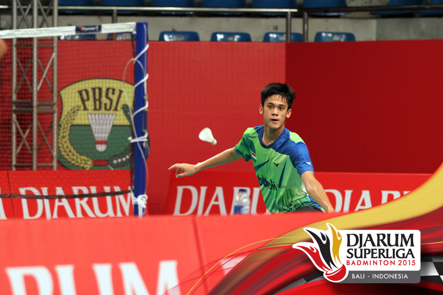 Firman Abdul Kholik (Mutiara Cardinal) berusaha menyambut pengembalian shuttlecock saat berlatih.