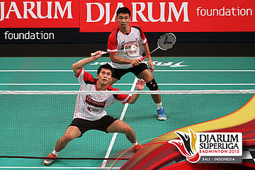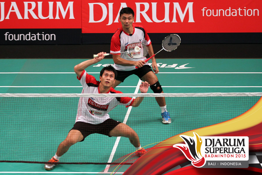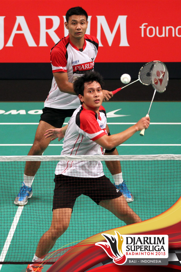 Berry Anggriawan/Moh. Ahsan (Djarum Kudus) mengembalikan shuttlecock ke arah Chayut Triyachart/Watchara Buranakuea (Granular Thailand).