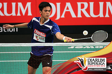 Dionysius Hayom Rumbaka (Djarum Kudus) bersiap menyambut pengembalian dari Prinyawat Thongnuam (Granular Thailand).