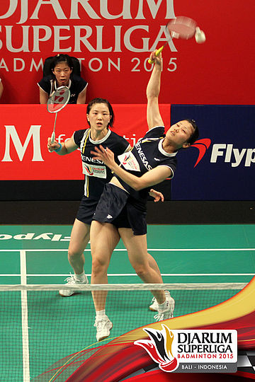 Miyuki Maeda/Reika Kakiiwa (Renesas Jepang) melepaskan smash ke arah Keshya Nurvita Hanadia/Meiliana Jauhari (Jaya Raya Suryanaga).