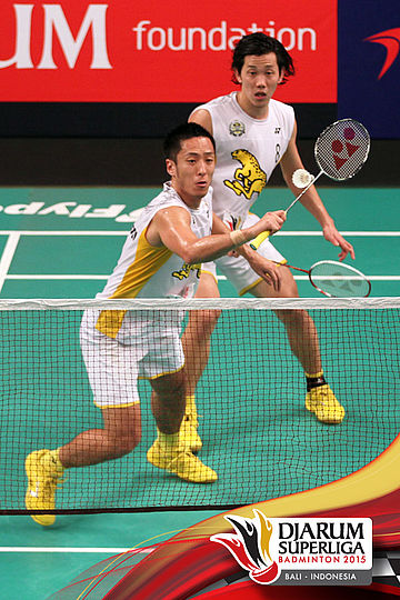 Noriyatsu Hirata/Hirokatsu Hashimoto (Tonami Jepang) menyambut pengembalian dari Hardianto/Ricky Karanda (Mutiara Cardinal).