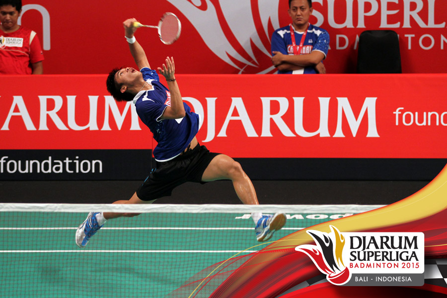Dionysius Hayom Rumbaka (Djarum Kudus) mengembalikan shuttlecock ke arah Prinyawat Thongnuam (Granular Thailand).