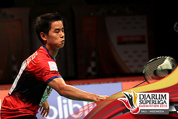 Simon Santoso (Musica Champion) mengembalikan shuttlecock ke arah Son Wan Ho (Djarum Kudus).