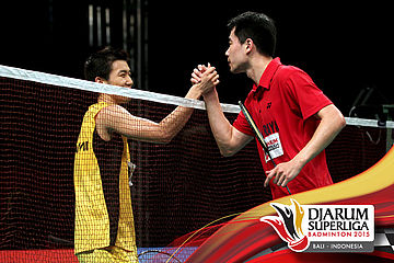 Wei Nan (Jaya Raya) bersalaman dengan Riichi Takeshita (Tonami Jepang) usai bertanding.