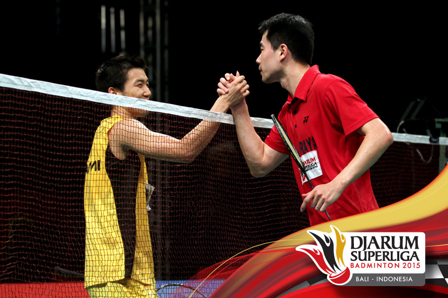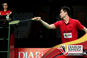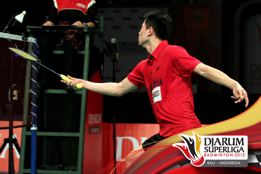 Wei Nan (Jaya Raya) mengembalikan shuttlecock ke arah Riichi Takeshita (Tonami Jepang).