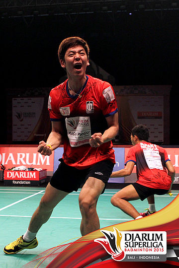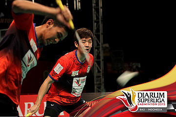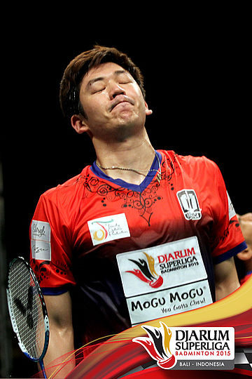 Lee Yong Dae (Musica Champion) mengembalikan shuttlecock.