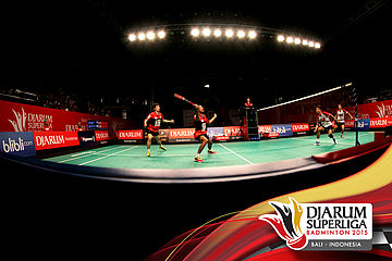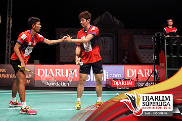 Fajar Alfian/Lee Yong Dae (Musica Champion) dan Berry Anggriawan/M. Ahsan (Djarum Kudus) sebelum bertanding.