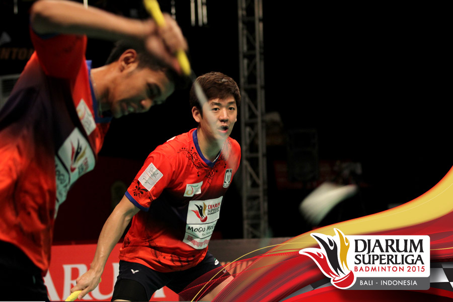 Fajar Alfian/Lee Yong Dae (Musica Champion) mengembalikan shuttlecock ke arah Berry Anggriawan/M. Ahsan (Djarum Kudus).