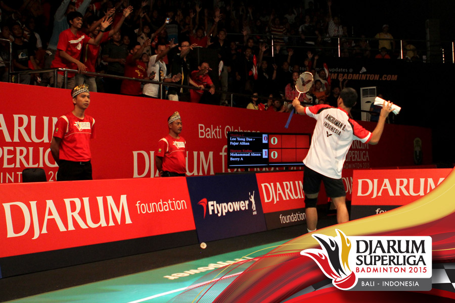 Selebrasi Fajar Alfian/Lee Yong Dae (Musica Champion) setelah berhasil mengalahkan Berry Anggriawan/M. Ahsan (Djarum Kudus).