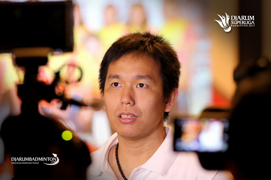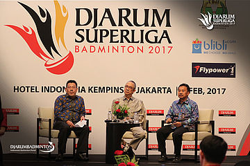 Bambang Roedyanto, Lutfi Hamid dan Budi Darmawan saat press conference acara Djarum Superliga Badminton 2017.