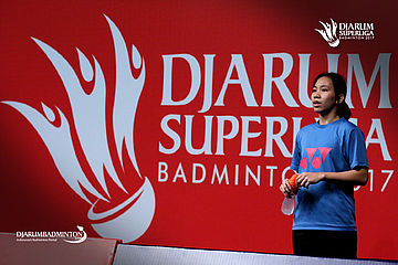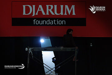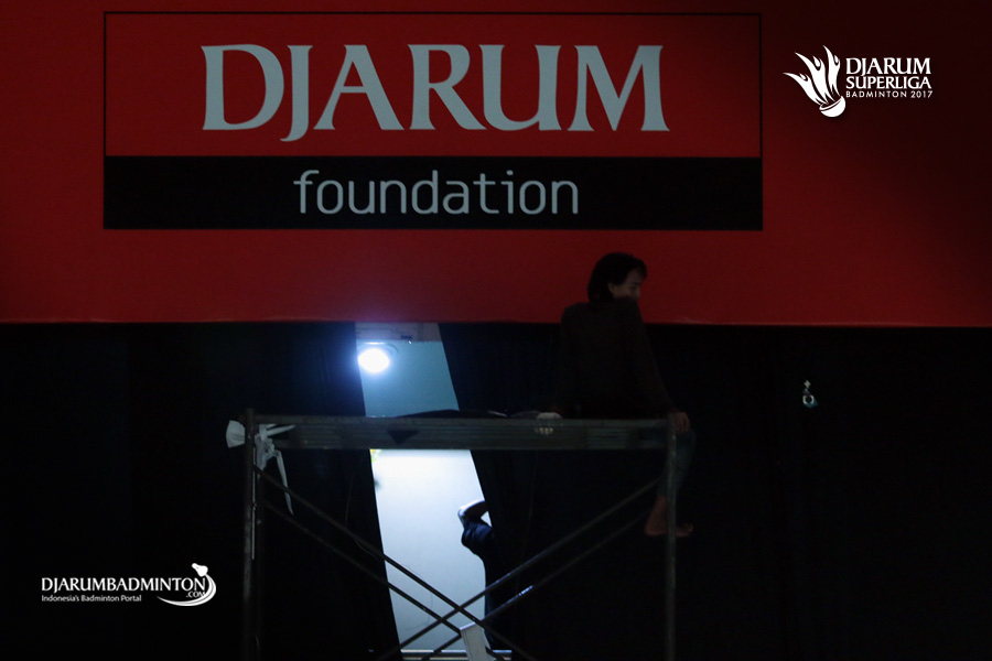 Seorang pekerja sedang menyelesaikan dekorasi Djarum Superliga Badminton 2017.