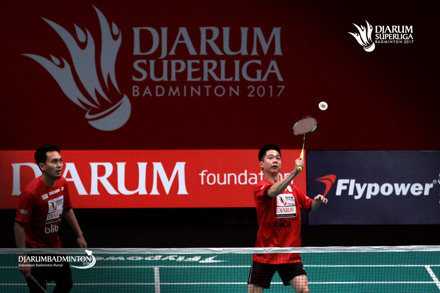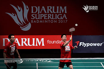 Kevin Sanjaya/Mohamad Ahsan (Djarum Kudus) saat berlatih di DBL Arena, Surabaya.