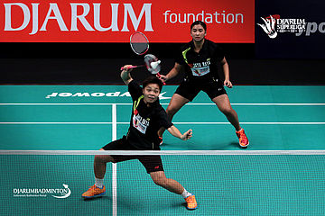 Apriyani Rahayu/Jauza Fadhila (Jaya Raya) mengembalikan shuttlecock.