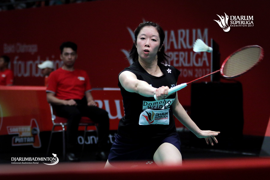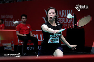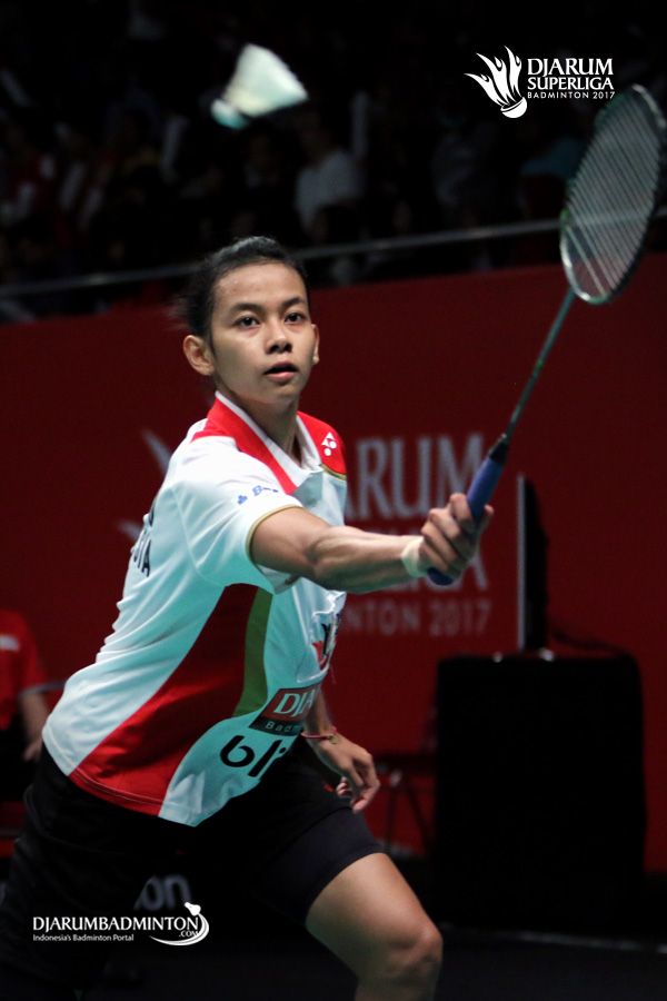 Dinar Dyah Ayustine (PB Djarum) mengembalikan shuttlecock.