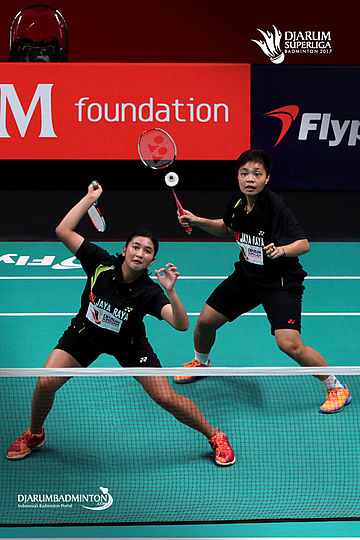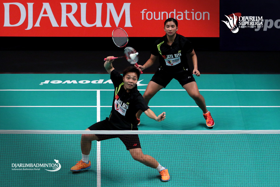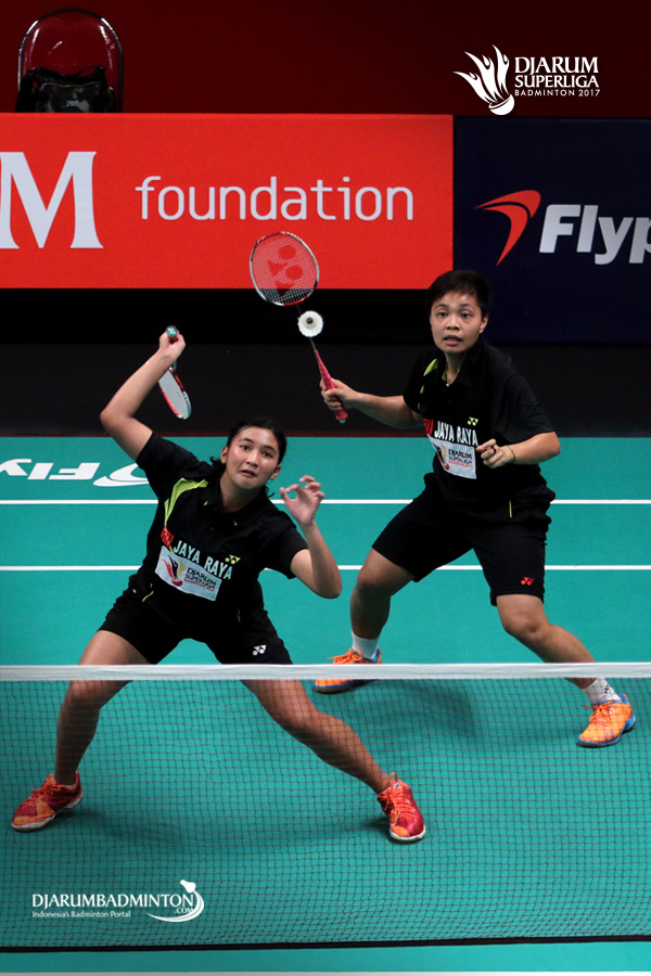 Apriyani Rahayu/Jauza Fadhila (Jaya Raya) bersiap menghadang serangan.
