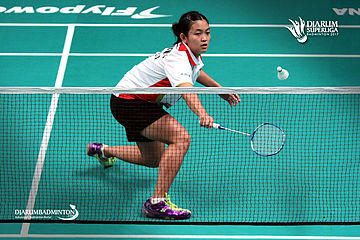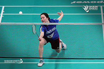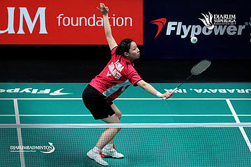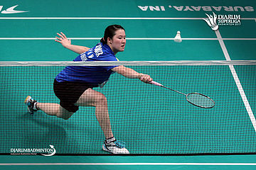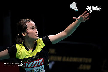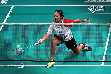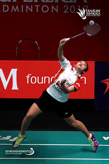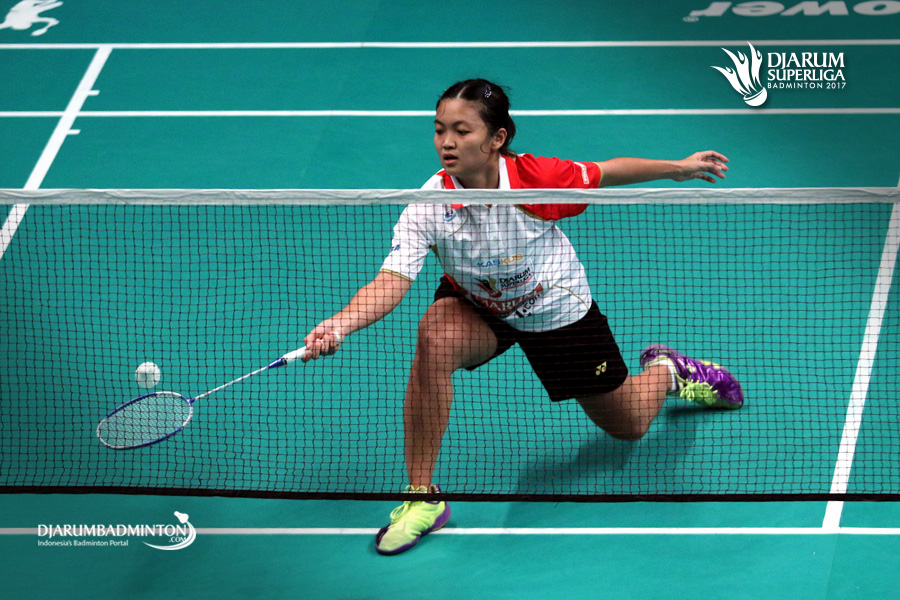 Savira Sandra Dewi (PB Djarum) mengembalikan shuttlecock.
