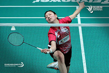 Nakamura Yuri (Hokuto Bank Jepang) mengembalikan shuttlecock.