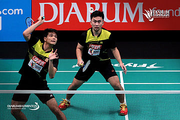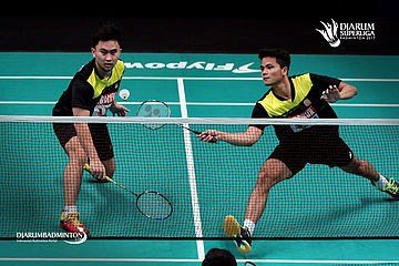 Akbar Bintang Cahyono/Bagas Maulana (USM Blibli.com) mengembalikan shuttlecock.