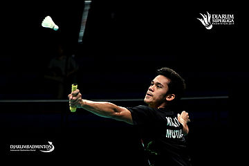 Firman Abdul Kholik (PB Mutiara Cardinal) melepaskan serve.