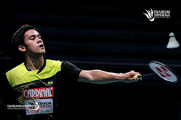 Firman Abdul Kholik (PB Mutiara Cardinal) mengembalikan shuttlecock.