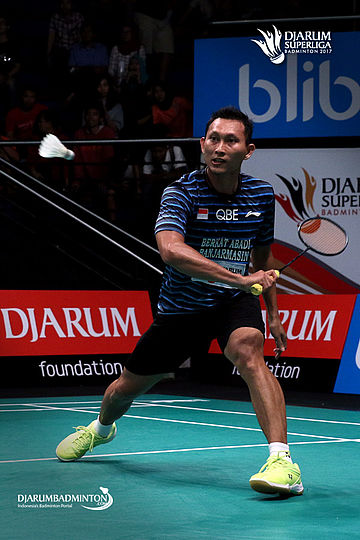 Sony Dwi Kuncoro (PB Berkat Abadi) mengembalikan shuttlecock.