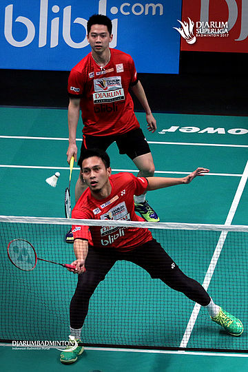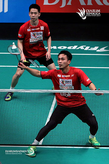 Mohammad Ahsan/Kevin Sanjaya (PB Djarum) menyambar pengembalian.