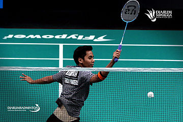 Ihsan Maulana Mustofa (PB Djarum) bersiap menyambar pengembalian.