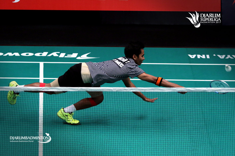 Ihsan Maulana Mustofa (PB Djarum) menghadang serangan.
