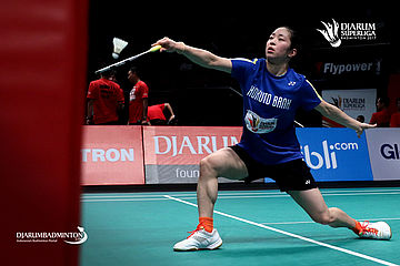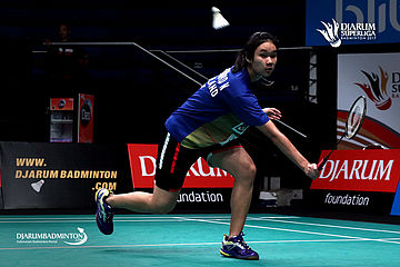 Fitriani (PB Tjakrindo Masters) mengembalikan shuttlecock.