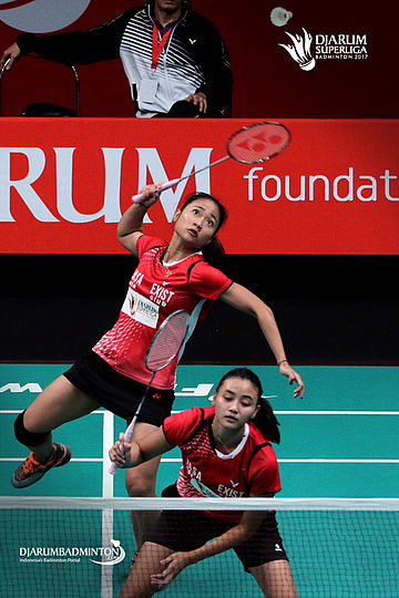 Meirisa Cindy/Ni Ketut Mahadewi (PB Tjakrindo Masters) bersiap menyambar pengembalian tanggung.