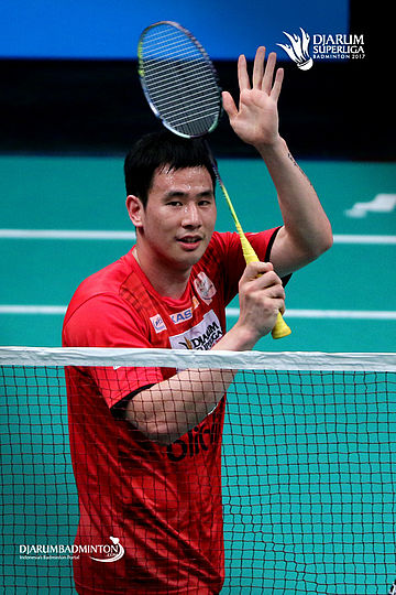 Ko Sung Hyun (PB Djarum) memberikan spresiasi kepada pengunjung Djarum Superliga Badminton 2017.