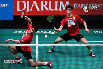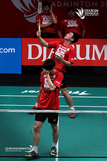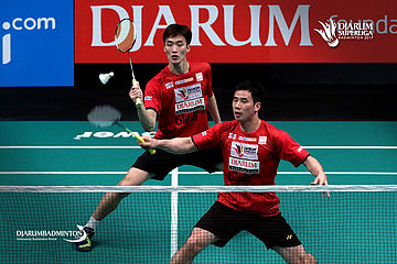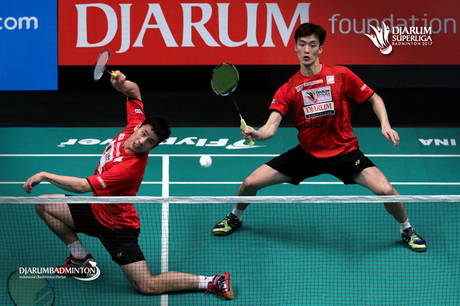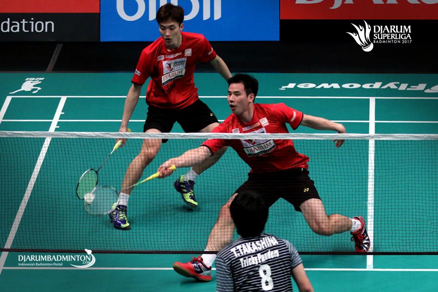 Ko Sung Hyun/Shin Baek Choel (PB Djarum) menyambut pengembalian.