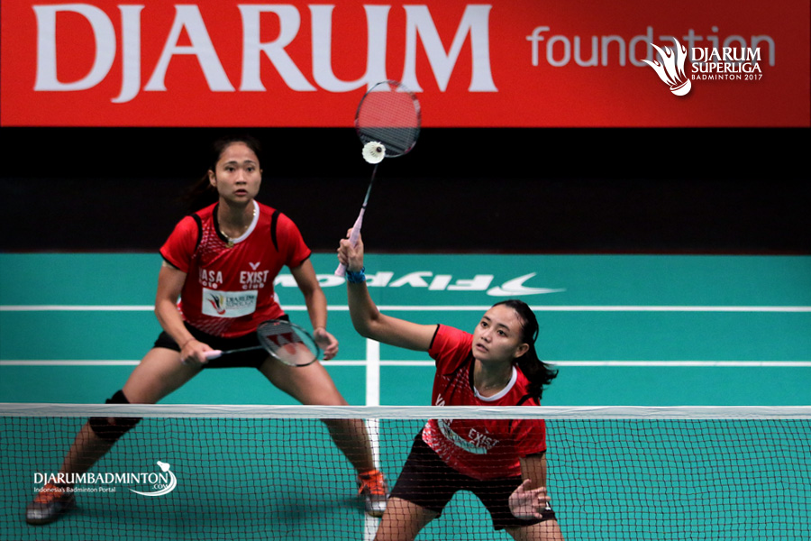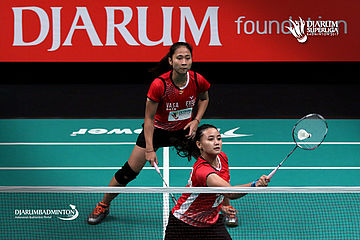 Meirisa Cindy/Ni Ketut Mahadewi (PB Tjakrindo Masters) bersiap melepaskan serangan.