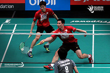 Ko Sung Hyun/Shin Baek Choel (PB Djarum) menghadang serangan.