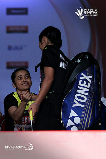 Hera Desiana (kiri) memberikan semangat kepada Gregoria Mariska.