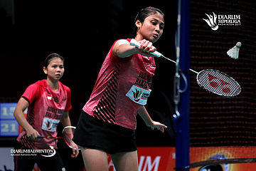 Greysia Polii/Rizki Amelia (PB Berkat Abadi) mengembalikan shuttlecock.