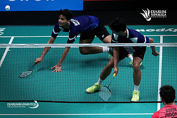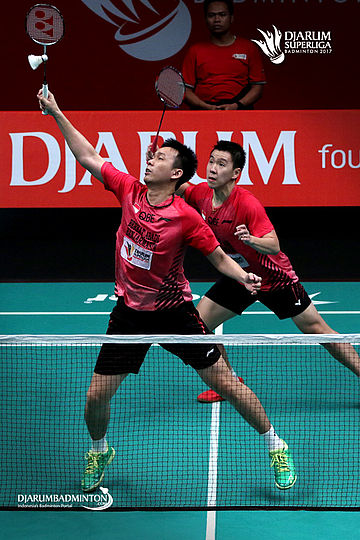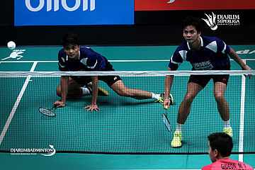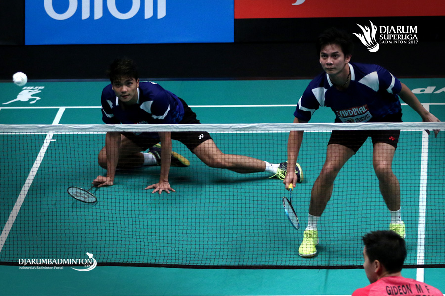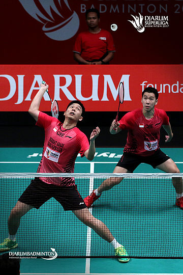 Andrei Adistia/Ricky Karanda (PB Mutiara Cardinal) menyambut pengembalian.