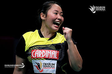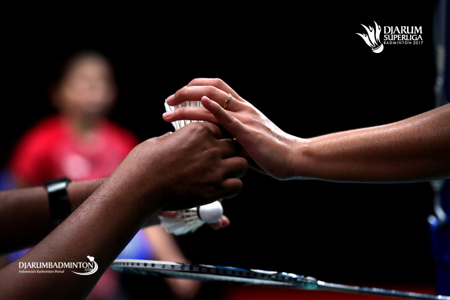 Nisak Puji Lestari (kiri) memberikan dukungan kepada Gregoria Mariska sebelum bertanding.